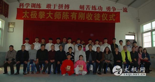 | 2015年3月29日上午,满园春色挡不住陈有刚的喜悦之情,他又喜获14名徒弟。收徒仪式在有刚武术学校圆满完成。