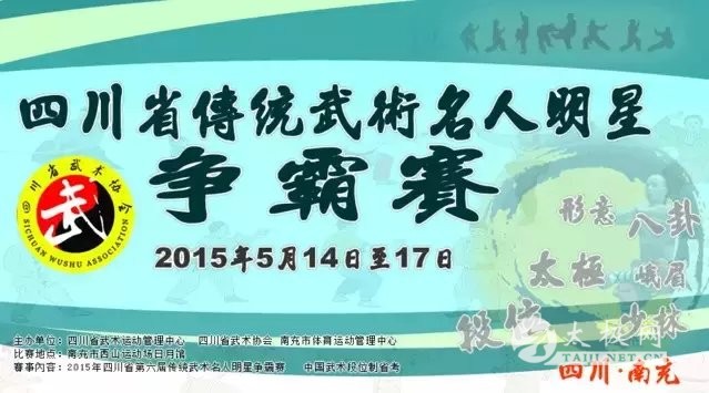 2015年四川省第六届传统武术名人明星争霸赛暨四川省2015年武术段位制“省考”竞赛规程 一、主办单位: 四川省武术运动管理中心、四川省武术协会、南充市体育运动管理中心 二、承办单位: 成都禅武文化传播有限公司 三、时间和地点: 2015年5月14日至17日 西山运动场日月馆 四、参加单位 (一)四川省各市、州、县、区武术习练者。 (二)全国“武术之乡”单位峨眉山市、宣汉县、夹江县、江油市。 (三)武术协会下属各拳种研究会 (四)有条件的企、事业单位、社会团体、学校、少年宫、民间武术组织、辅导站。 (五)经许可的个人(含国外友人)。 五、参加办法 (一)以市、州体育(文体)局和全国“武术之乡”,以及县 (市、 区),各拳种研究会为单位组队; (二)以企事业单位、社会团体、学校、段位考试点、少年宫、民间武术组织、辅导站为单位组队; (三)以个人名义参赛的运动员,以及其他运动员、教练员必须是中国武术协会个人会员。 (四)每队可报领队1人、教练2人、队医1人、运动员人数不限。年龄组别如下: A组:12周岁以下(2004年1月1日之后者)。 B组:12周岁至18周岁以下(2003年12月31日-1998年1月1日)。 C组:18周岁至40周岁以下(1997年12月31日-1976年1月1日)。 D组:40周岁至60周岁以下(1975年12月31日-1956年1月1日)。 E组:60周岁以上(1955年12月31日以前者)。 (五)每名运动员最多报2个单项(1个拳术、1个器械) (六)运动员年龄、健康状况均由各代表队自行审核,以报名单上的盖章或负责人签字,作为确认依据。如因年龄不实,一经查实则取消该运动员竞赛资格。竞赛期间因健康情况而引发的伤病等,均由各单位和个人自行负责,经费自理。 (七)参赛运动员必须办理好赛会期间的“人身意外伤害保险”,未办理者不能参赛。凡委托大会办理“人身意外伤害保险”的,必须在报名表上注明委托保险,并缴纳相关费用;凡自行办理“意外伤害保险”者,报名时同时邮寄《意外伤害保险单》复印件,其它医疗保险等均无效。凡已由学校集体做了意外保险的学生,可由保险公司出具集体名单的保险证明。 (八)参赛人员均须签署《免责声明书》,参赛者每人一份,并在报到时上交,凡未签署《免责声明书》的选手不能参赛。 六、竞赛项目(报名编号见附件1) (一)传统拳术 1、四川流行拳种:孙门、岳门、赵门、洪(鸿)门、会门、字门、化门、盘破门、黄林、余家拳、松溪内家拳等。 2、传统拳一类:形意、八卦、八极 3、传统拳二类:通臂、劈挂、翻子 4、传统拳三类:地躺、象形 5、传统拳四类:查拳、花拳、炮拳、红拳、华拳、少林拳、武当拳、其它传统拳。 (二)传统器械 1、短器械:(1)刀、(2)剑、(3)南刀、(4)其它短器械(扇子、匕首、拐等)。 2、长器械:(1)棍、(2)枪、(3)朴(大)刀、(4)南棍、(5)其它长器械(杖、铲、叉等)。 3、双器械:(1)双刀、(2)双剑(含长穗双剑)、(3)其它双器械(双钩、双匕首等)。 4、软器械:(1)九节鞭、双鞭(含刀加鞭)、(2)双节棍、三节棍、(3)流星锤、绳镖。 (三)太极类(含规定和传统太极): 1、太极拳: (1)陈式、(2)杨式、(3)吴式、(4)孙式、(5)24式太极拳、(6)42式太极拳、(7)李雅轩太极拳、(8)彭祖太极(9)和式太极拳(10)杨式散手太极(11)武式 2、太极器械 (1)三十二式太极剑(2)四十二式太极剑(3)传统太极剑(4)太极枪(5)太极扇(6)太极刀 (四)段位制套路(只用于考段,不列入比赛成绩) (1)长拳、(2)少林拳、(3)陈式太极拳、(4)杨式太极拳、(5)和式太极拳、(6)武式太极拳、(7)吴式太极拳、(8)孙式太极拳、(9)形意拳、(10)八卦掌、(11)通臂拳、(12)戳脚、(13)翻子拳、(14)八极拳、(15)螳螂拳、(16)五祖拳、(17)咏春拳、(18)武术功法、(19)自卫防身术(散打)、(20)剑术、(21)短棍、(22)两节棍、(23)趣味武术(段前级教程) 七、竞赛办法 (一)本次比赛为个人单项赛。 (二)比赛采用中国武术协会2012年制定的《传统武术套路竞赛办法》(试行)和原国家体委武术研究院编印的各式《太极拳、剑竞赛套路》及有关补充规定。 (三)运动员的参赛服装、武术鞋不做规定,但要体现出项目特色、民族特色和时代特色。 (四)同类拳种、器械不分男女集中编组竞赛,每个项目报名不足6人时,将按类型相近项目混编进行比赛,每一组别人数不足6人,并入下一个年龄组。 八、录取名次 (一)传统拳术和器械分类别按各年龄组不分男、女录取一等奖(按15%比例四舍五入录取)、二等奖(按20比例按四舍五入录取)、三等奖(按25比例按四舍五入录取)。 (二)每个项目一等奖的运动员将颁发金牌及证书奖励;二等奖、三等奖运动员颁发证书奖励。 (三)设“四川省武术年度名人”和“四川省武术年度明星”奖,由四川省武术协会和四川省武术运动管理中心聘请专家组成评审团,按照大会年度名人、明星评选办法,从一等奖获得数中评选出不高于各10名的“2015年四川武术年度名人”和“2015四川武术年度明星”,并给予颁发奖杯及证书奖励,并获得在四川省武术协会官方网站“四川武术网”上进行个人资讯的长期推广和宣传资格。 (四)连续三年获得四川省武术名人的运动员将授予“四川省武术名家”。 九、中国武术段位制评审办法 (一)申报条件(申报者必须具备以下基本条件): 1、年龄要求:年龄6周岁(含)以上才可进行中国武术段位制段前1-3级的考试。年龄达10周岁(含)以上,可申报一段考试;年龄达15周岁(含)以上,可申报二段考试;年龄达18周