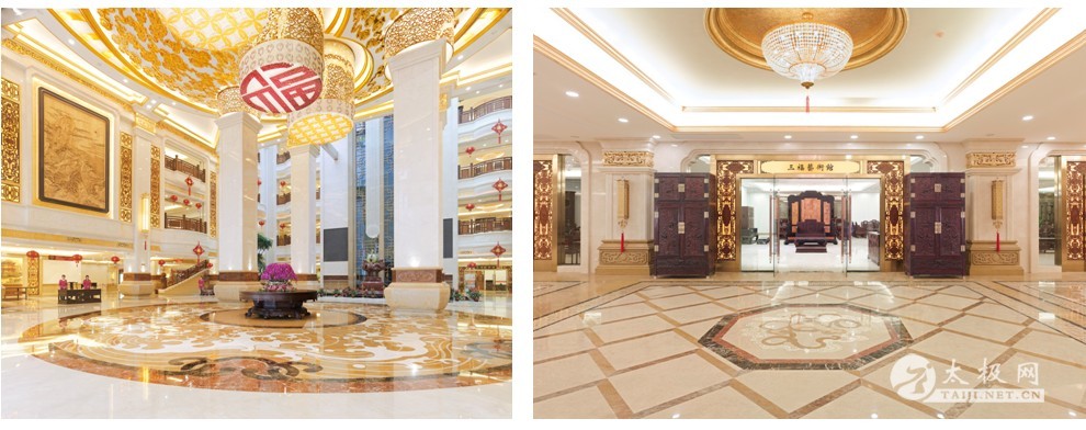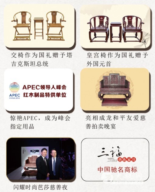 公司现拥有国内最具规模、最具品味、最具特色的红木家具展示馆—三福艺术馆。该艺术馆位于中国古典工艺博览城核心区,占地面积57亩,建筑面积65000平方米,为两幢古典建筑风格展厅,先后被授予国家AAAA级旅游景区,福建省第一批非物质文化遗产保护示范基地、首批福建省重点创意产业示范基地、中国政协文史馆工艺美术研究院副院长单位、中央党校报刊社文化发展部创作基地等荣誉称号,是一个集红木家具和工艺精品展示、销售及古典文化交流品鉴于一体的综合性平台,吸引了数十家工艺臻品龙头企业和上百家佛珠·工艺品小件厂家及银行等金融机构入驻,打造了一座充满生机活力的古典家具文化新坐标。 公司始终以复兴中华文化为使命,努力践行中华文化的传承。公司的明式交椅和皇宫椅,先后两次成为国礼,作为国家领导人赠与外国元首的文化艺术珍品;公司的紫檀雕龙宝座继成龙和平友爱慈善晚宴以650万元的高价义拍之后,又惊艳时尚芭莎明星慈善夜现场;作为2014北京APEC领导人峰会红木制品特供单位,公司的多件红木臻品在主会场亮相,为APEC增加中国元素。三福艺术家具,匠心打造,初心不忘,为构筑中国深厚的软实力添砖加瓦,为实现中华文化的伟大复兴贡献力量! 仙游宗杰太极拳馆 (国际太极拳大师陈小星与三福古典家具总经理黄福镇先生合影)