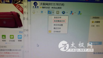 | 参加太极拳网络视频大赛,视频已经录好,该怎么提交呢?相信不少拳友都遇到了这样的问题。我们就此为拳友提供详细的传送方法: 传送视频主要有三种方式:QQ,邮箱,网盘。经本人实测,网盘方式最为简单,其次邮箱,QQ传送最麻烦且最容易造成视频的丢失和传送失败。所以优先推荐网盘和邮箱方式。 下边具体说说每种方式的方法: 首先,说说QQ传送视频的方法 1、如下图中,在QQ的最下方点击查找 2、之后会弹出下图这个界面,输入我们太极网的QQ号,点击查找 3、之后的界面如下图,选择点击红圈圈住的图标。这里推荐选择添加好友,以便于和我们进行进一步的沟通。 4、如下图,会出现聊天对话框,点击第3个图标,在之后点击发送离线文件 5、之后按照路径找到录制的视频,选定之后点击打开。 6、之后就会显示文件发送成功,只等我们的人员接收文件。 其次,邮箱发送视频