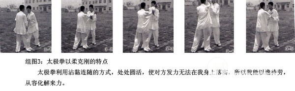 太极拳行气运劲所到的身体部位,强度和抗击打能力可得到提高。但太极拳顺其自然,避实就虚,不与对手顶力、硬碰硬,发劲是作用在对手失重部位或薄弱环节,所以顺畅,势如破竹。太极散手该出手时就出手,不可有丝毫犹豫,否则机会稍纵即逝,反被人制。 太极散手落实于打,有机会就出手。对方用力打来,我用螺旋劲可轻易将其力从切线方向化开,并从接触部位钻入,以螺旋劲打向目标。不招不架就一下,“化”与“发”仅在一吸一呼之间完成,这是太极散手克敌制胜的精髓。 3.太极运劲方式在散手实战中的作用 太极化劲方式可以形象地比喻为用一张有韧性的炕席沿两根立柱傲“~”缠绕,我在中间向左前拽,席子往左立轴输送,作用力使右侧的席尾沿右立柱向右后转。这一过程体现了太极拳的“进中有退”、“退就是进”的道理。 这种运行方式可用于太极散手的近身格斗。对方用双掌向我胸部“虎扑”,我已站成左脚在前、右脚在后的侧身步,右前臂到胸前格挡。彼右掌按我右腕背部、左掌按我右肘向我发力,企图将我右臂贴身一齐放出;我用掤劲接住来力,并不与之顶抗,仅黏住来力,肩及后部各关节松开,运行的内劲使身臂具有柔韧性和弹性劲,起到缓冲作用。此刻,我右腿用劲碾地,身体率先沿“~”向左前方移,使身左侧向前转时将右侧让出空当,使彼推向我支撑身体脊椎中心线的矢向力,经我松柔的右臂向右转发生偏离,这时我身体似立轴转进而右臂被彼推向身后,我右掌在内旋中缠住他右腕,在与彼相向运动中不发生对顶,进中有退,实现了动平衡,达到了以柔克刚的目的。 (1)我右臂感觉到对方双掌已推空、身体前倾失重时,右掌捋彼右腕使其身向后仆出。此时,我虽然不能决定对手如何给力,但是可以通过接触部位“听力”知道他的动态,并根据他的来力调整自己的劲路,“彼不用力,我也不用力,我意在先;彼用力,我也用力,我劲在先”。当他全身力发出时,我用整劲掤住着力部位,随其力的方向转身,轻易就能将他放出。这就是太极的“力从人借,劲从己发"。把对方引进落空,导致他失重,就能“四两拨千斤”。 (2)若对方“虎扑”打空后迅速回撤,我双掌仍“黏”着他右臂“随屈就伸”由于他发力后身成定架,动一处可牵扯全身。此刻我“出奇在转 关”,拧身抖转,由捋变按,双掌将全身整劲贯向彼右侧身臂,彼必然翻倒。 (3)若对方“虎扑”打空,已松身后退。我左螺旋转身,左掌变为内旋托彼肘,右掌变成外旋缠紧彼右腕,“固住梢端",顺水推舟,加速送彼回返,彼身直接进退会产生晃动使足 跟不稳。我身体沿着“~”轨迹向前移,运行中身旋转劲将彼臂身拧成一体,此刻,我左掌按击他右肘前臂外侧,其右大臂向后斜,使其身蓦然后仰。 通过实践,弄懂运劲原理,练到得心应手,用时便章法清晰。太极劲法是灵活多变的,如他双掌扑来,见我右臂护胸便改为扑面掌,我以太极左右交替螺旋运劲之法,可左臂逆时针由下向上挑开来掌,右臂甩臂弹掌用右手背扇击彼面门。横力本来就能克竖力,再加上有连绵整劲做后援,转动的单臂可不费劲地挑开对方直进的双掌。 三、太极散手的训练要联系实际 太极拳平时的养身盘架要和散手实战结合起来,如此每天练功既能强身健体,又能使身体总处在“太极状态”,一旦遭到突袭,就会既有实战必有的体能,又有灵敏的反应能力。要得到正确的太极劲法,必须练基本功、练太极拳套路和太极推手,再练散手,久而久之自然能眼到手到、意到劲到。 1.太极散手的接招及还击 举一典型实例。当凶犯右手反握锋利的匕首直刺过来时,没有受过训练的人会出现这几种情况的反应: (1)不知所措眼睁睁被刺上了。 (2)奋力前扑,用手去夺匕首,结果受伤后失去战斗力。 (3)转身就跑,被凶犯追杀。 以上三种做法都很难逃脱厄运,反应慢了会被刺,还手早了也无效。要解除匕首的威胁,关键在接手的技术,必须掐准对手的“点”。面对这种情况,首先,镇定地注视匕首刺来,虽然匕首离我越近越危险,但“机会往往隐藏在危险之中”。如果我左脚在前,匕首到我身前时我迅速右转闪让,同时用右手从侧面“叼住”对方右手腕内旋用劲下压,左手上托他的右肘,二掌合力顺时针旋拧他的右臂,迫使他身前倾,我就势提右膝猛石盖他右小臂,使匕首跌落,令他小臂受到重创失去攻击能力,如此方能化险为夷。 另外,还有很多技法,比如,我双手接住对方的右臂,借向右后缠转的反作用力将前面的左脚伸进,再随重心前移进身,由于我双手拧掀其右臂致他身前无遮拦,我提右腿用膝盖直撞对方裆部,便可一招制敌。当然,再好的功夫徒手对付手持凶器的歹徒也处于劣势,如果时间允许应尽量采取有效的处置措施,没有必要冒空手夺白刃之险。 2.太极散手的擒拿与发放 太极散手的拿法不同于传统武术的抓筋拿脉,而是利用肢体在全身运动中缠裹、别挡对方的肢体的方式实施控制,再进行定向打击或使其失重后发放。太极散手“发前有一拿”,指将对手拿至“背势”,再顺劲发放,如此则干脆利落,毫无悬念。 比如,我右手缠紧行凶歹徒的手腕,左掌上托其肘尖成为“支点”,成倒剪臂时成为“杠杆”,彼若用力挣扎手臂就会僵挺,此时我全身抖转发劲,彼臂即刻分筋错骨。这与传统擒拿术有异曲同工之妙。 至于反擒拿,当彼双手拧我一臂时,我若完全松懈就会被他一拧到底而无法解脱。我应该身臂