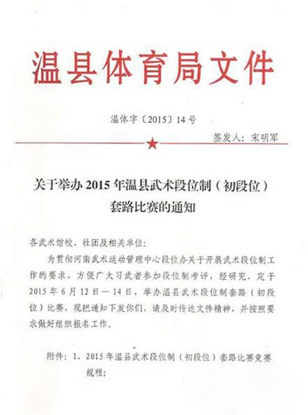 各武术馆校、社团及相关单位: 为贯彻河南武术运动管理中心段位办关于开展武术段位制工作的要求,方便广大习武者参加段位制考评,经研究,定于2015年6月12日—14日,举办温县武术段位制套路(初段位)比赛,现把通知下发你们,请及时传达文件精神,并按照要求做好组织报名工作。 附件:点击下载>>>关于举办2015年温县武术段位制比赛的通知.rar(包含以下内容) 1、2015年温县武术段位制(初级)比赛竞赛规程; 2、2015年温县武术段位制(初段位)套路比赛安全责任声明书; 3、2015年温县武术段位制(初段位)套路比赛报项表。 温县体育局 二Ο一五年四月八日 |