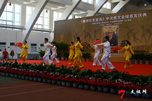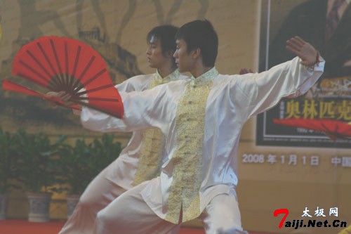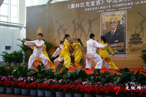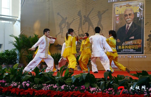 腾讯体育刘学杨露莎北京报道 2008年1月1日,文明杂志社和北京体育大学携手,于顾拜旦诞辰145周年之际在北京体育大学举办奥林匹克宣言全球首发庆典。图为北京体育大学体育艺术团太极表演队在现场献上太极表演《永不放弃》。