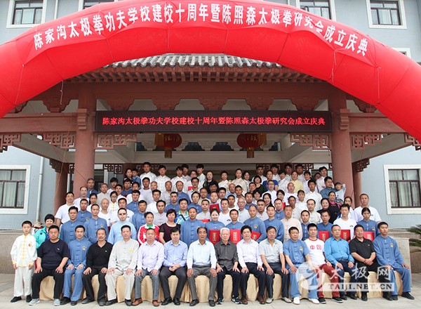 五一国际劳动节,陈家沟王庭酒店热闹非凡,陈家沟太极拳功夫学校的学生齐聚一堂为陈家沟太极拳功夫学校十年校庆暨陈照森太极拳研究会成立仪式庆祝。 焦作市太极拳协会会长赵功佩,焦作温县人民政府副县长张金太,温县体育局局长宋明军,陈家沟太极推广中心主任陈皂罗,广东客属文化产业开发投资有限公司董事长郑辉宇,太极网总经理刘洪奇以及太极拳杂志主编王娟,纷纷向陈家沟太极拳功夫学校校长陈照森先生表示祝贺。