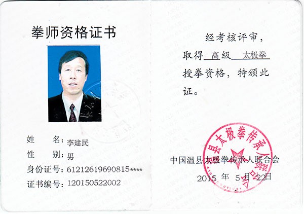 陈式太极拳传人李建民荣获太极拳高级拳师证书