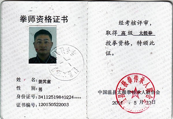 姜其童,男,84年2月生,安徽定远人,退役军人,自幼爱好武术,习练武术基本功,气功,高中为体育专业特长生,04年参军入伍,成为西北野战军快速反应部队一员。06年退役后随陈氏太极拳小架11代传人韩小战先生学习太极拳套路,少林寺易筋经,后随陈氏太极拳小架11代传人韩兆安先生学习推手、器械;并得到陈伯祥和陈清环两位大师亲自指点。在练习太极拳的过程当中多次参加广东、中山、深圳等地太极拳武术汇报表演活动,受到好评,2010年开始传播太极拳文化,先后在广东,江苏,安徽,上海等地授拳,所教学员遍布各地。2015年受聘于国学大师南怀瑾老师督办的太湖“江村市隐”为功法教练,传播祖国太极拳及传统功法。现为陈氏太极拳12代传人。 |