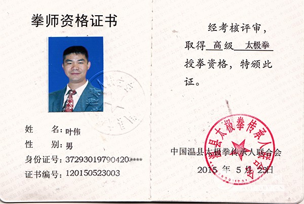 陈式太极拳传承人叶伟荣获高级拳师证书