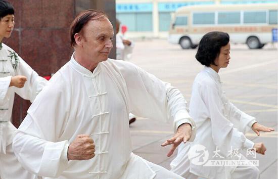 | 5月24日,成都市“太极蓉城”2015年社区广场健身活动月太极拳展示活动在八益家俱广场举行,在活动现场,来自成都市武术协会各太极辅导站共25支队伍1000多人依次登场展示着刚柔并济的太极拳。 在展示人群中,一名高个子老外在人群中显得尤其显眼,一招一式都有模有样。这位名叫马丁的美国人,63岁,目前是成都某中学的外教,在成都已经生活工作了4年多,他的妻子就是成都人,马丁说得一口流利的中国话。他习练太极已经有几年时间了。