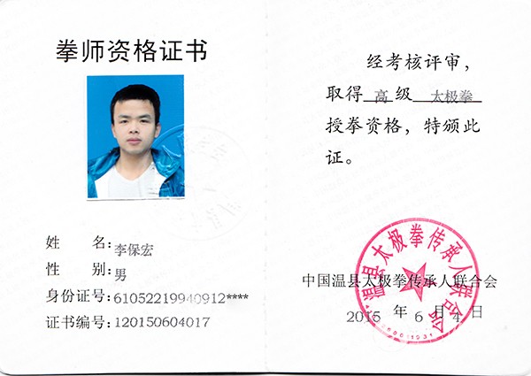 陈式太极拳传承人李保宏荣获太极拳高级拳师证书