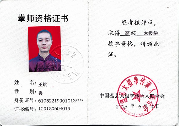 陈式太极拳传承人王斌荣获太极拳高级拳师证书