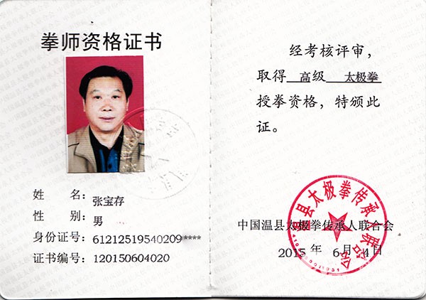 本人自幼酷爱武术,活泼好动。71年跟随师父学习摔跤,76年随师父学习陈氏太极拳小架,由于当时历史条件制约无法正确体现师徒关系。时光荏苒,岁月如白驹过隙,转眼年届退休,为了再续与师父的前缘,也为了更好的学习陈氏太极拳小架,2008年拜赵学法为师,有幸正式成为陈氏太极拳小架第十二代弟子。 多年来,师父带领徒弟阅读领会了许多有关陈氏太极拳小架的理论基础知识,师父不厌其烦的示范拳架套路、演练功法、技击用法以及攻防意识,细致入微地教拳改拳,让我深深的体会到学习太极拳非一日之功。自2008年以来,在师父的教授下先后系统学习了陈氏太极拳小架、剑、杖、春秋大刀、推手等技艺。 在勤学苦练各种技艺的同时,也为了检验自己对于太极拳的领悟,从2013开始参加各种比赛。 2013年4月参加河南温县央视武林大会走进陈家沟的比赛,荣获陈氏太极拳小架拳、杖二等奖。 2013年11月参加四川省德阳市武术联赛,荣获陈氏太极拳小架一等奖。 2014年12月,参加四川省第八届老年人运动会,荣获传统太极拳第六名,太极杖第五名。 太极拳是中国文化的精髓,为了更好的弘扬陈式太极拳小架,2013年至今在谨遵师门门规的要求下,收七名太极拳爱好者为徒。 华夏文明,源远流长,太极文化,博大精深,唯有坚持不懈、勤奋进取,深入理解太极之精髓,为弘扬太极拳做出应有的贡献。 张宝存拳照 |