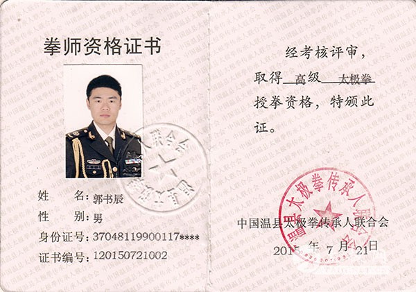 郭书辰 ,1990年1月生于山东省滕州市,中国共产党党员,2010年服役于北京军区某警卫部队。陈式太极拳第十二代传人,中国武术协会会员,国家一级武术教练,一级武术裁判员,一级社会体育指导员,北京军区八一体工队职员。中国武术六段。他的太极功夫具有迅、猛、灵、惊弹的特点。演练套路似行云流水,连绵起伏,舒展大方,形神兼备。 郭书辰,山东省滕州市人,他自幼习拳,是陈家沟陈氏十九世、太极拳第十一代嫡宗传人陈正雷大师弟子。陈家沟陈氏二十世,太极拳第十二代传人。1990年生,大学学历,现任浙江大学陈式太极拳协会名誉会长、四川大学太极拳陈式分会名誉会长、北京科技大学武术协会太极拳教练。北京军区司令部某警卫部队格斗教练,平日练功刻苦勤奋,功夫深厚纯正,理论研究颇具造诣。 多次获各类武术运动会及军队武术比赛太极拳、剑、推手比赛冠军。少年时,他曾经参加河南省武术比赛多次获第一名,2006年参加哈尔滨全国首届太极拳推手邀请赛荣获第一名。 获奖情况如下: 2004年获河南省武协杯太极拳比赛:男子长器械春秋大刀第一名。 2004年获中国马鞍山国际太极拳邀请赛:男子推手65公斤级第一名。 2007年获中国焦作第四届国际太极拳年会:长器械春秋大刀优秀奖。 郭书辰拳照 |