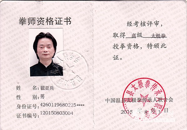 翟亚兵, 1968 年出生于安徽巢湖槐林花山村,中国武氏太极拳第 6 代传人,武魂百杰,高级太极拳拳师,首届国际网络视频大赛最美太极人,安徽省优秀社会体育指导员,武氏太极巢湖分院院长,巢湖尚武太极馆馆长。 少儿时期体弱多病,年轻时期疾病缠身,曾多次晕倒在工作岗位上, 1 米 72 的个子,体重只有 103 斤。为此,他发愤要强身健体。 1997 年在江阴工作时偶然练习太极拳,坚持一段时间的练习后发现身体状况大有好转。并在“连云港全国太极拳交流赛”上获得陈式太极青年组三等奖。 2004 年翟亚兵回到自己的家乡巢湖市槐林镇创业,并坚持太极拳的练习,在这期间又接触到杨氏和陈氏太极拳, 于 2008 年底正式拜中国武当百杰、中国武术七段、 中国武氏太极名家、武氏太极拳正宗第五代传人孙建国先生为师, 经孙先生严格考察后,翟亚兵成为孙建国先生的入室弟子, 后研习修练,尊师重道,广交武林同道之友, 20 余年,练功不缀,后期专练武氏太极拳,得师父厚爱与赏赐,现有幸成为中国武氐太极拳第六代传人,曾多次与师父参加国际、全国传统武术精英赛,获金牌、银牌铜牌数十枚。 2010 年委以重任当选为巢湖市太极拳协会会长,他常常奔波于庐江与巢湖之间。翟亚兵在庐江和槐林都有自己的产业, 一般住在庐江多一些。 由于协会松散,健身活动常常开展不起来。为此,翟亚兵放下庐江的经营而不顾,家人与他常常为此发生矛盾。经过痛苦抉择,他最后放弃了两处产业,来到巢湖全身心投入到全民健身太极拳推广的工作上。 翟亚兵从 2010 至 2015 年任巢湖市太极拳协会两任会长期间,多次在市区和外省市开展太极拳交流活动。 2012 年在福州“第六届南少林华夏武术大赛”获得武氏太极拳拳、太极球各一枚银牌; 2013 年在“首届厦门武术精英电视赛”上夺取武氏太极拂尘金牌、武氏太极拳银牌、太极球银牌各一枚;并获得组委会颁发的武术发展贡献奖; 2014 年 7 月份在浙江仙居参加“首届武式太极拳传承论坛峰会”, 2014 年 4 月份创办巢湖尚武太极馆。 2015 年参加首届国际网络视频大赛获一等奖,并有幸被大会组委会评为最美太极人光荣称号; 2016 年应邀参加南太行【万仙山】国际武术节代表永年武式太极学院巢湖分院一行 6 人分别获得金牌 3 枚、银牌 4 枚、铜牌 3枚的好成绩; 2016 年 6 月携学生 7 人参加永年武氏太极学院揭牌庆典,并在永年武氏太极学院参加【国术名家大汇演】展示了精彩的武氏太极拳; 6 月 19 好应邀携 6位学生参加古武当【科技杯】国际武学交流大会,共获金牌 3 枚、银牌 3 枚、铜牌 2 枚的好成绩,并有幸被国际武学文化发展促进会、【武魂】杂志编辑部、中国古武当国际武学交流大会组委会授予【武魂百杰】光荣称号! 这些年,翟亚兵老师心中有盏不灭的灯,一直在为中国传统太极拳事业践行着,努力着,事先不被家人和朋友理解与支持,而太极拳精神一直引导着他,从未言放弃对太极拳文化的追求和热衷。心在哪里,收获就在哪里,能力有限,努力却是无限,功夫不负有心人,通过努力,先后在巢湖市公安局、巢湖市人民法院、安徽省巢湖管理局、巢湖汽运公司、合肥职业技术学院、巢湖中创房地产开发有限公司、巢湖(美国)金仕堡健身会所等任教武氏太极、陈氏太极拳等器械,学员数以百计,同时得到了社会的认可和尊重。 翟亚兵老师为人虔诚,博学儒雅,广交天下武林,尊师重道,崇德尚武,有一颗对太极拳事业发展与传承的炽热之心,有一种对太极拳事业奉献与执着的大爱情怀;有一种对太极拳事业践行和责任的担当精神!!! 翟亚兵拳照