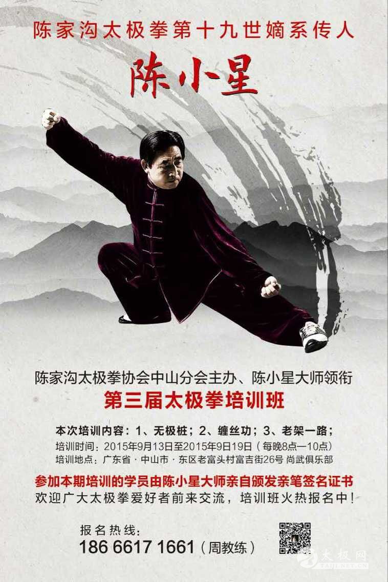 陈小星大师于广东省中山市2015年第三届太极拳老架一路培训班开始报名了,为了更好的普及与推广太极拳,同时也应广大太极拳爱好者的要求,陈小星校长将于2015年9月13号举办培训班。 具体事宜公告如下: 一、培训时间和地点 时间:2015年9月13日至2015年9日20日(每晚8点—10点) 地点: 广东省中山市东区老富头村富吉街26号 尚武俱乐部 二、参加培训人员及条件 1、各地的陈氏太极拳组织及太极拳爱好者 2、年满16岁以上者 3、没有传染性疾病及精神系统疾病者 4、能独立完成学习任务者 三、培训内容 1 无极桩 2 缠丝功 3 老架一路 四、培训证书 培训结束后,颁发由陈小星大师亲笔签名的结业证书 五、收费标准 1、学费2000元 (t恤衫、光盘一张) 六、报名时间 即日起开始报名 七、报名方式 1、电话报名 手 机:18666171661 联 系 人: 周直艳