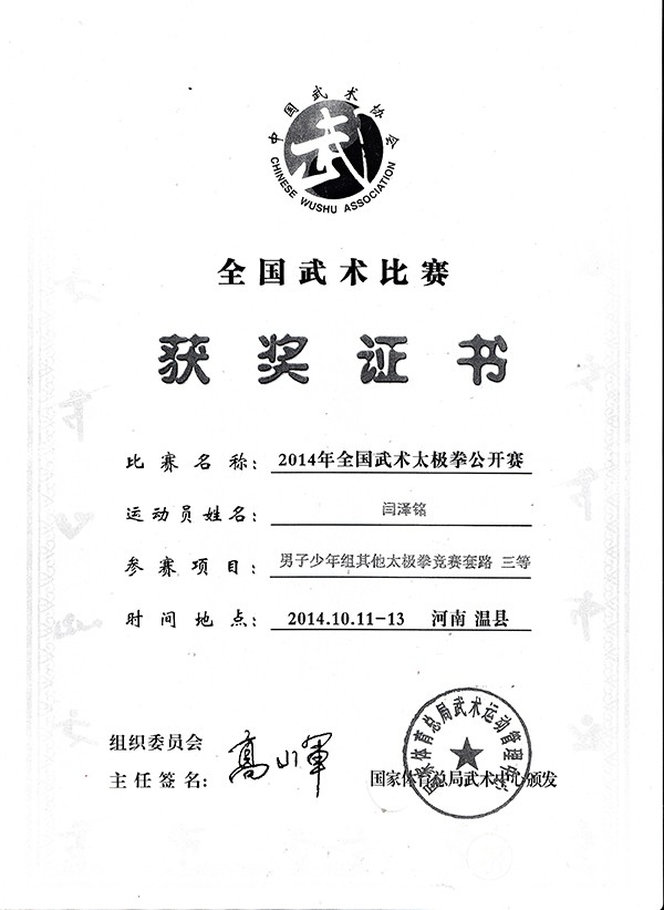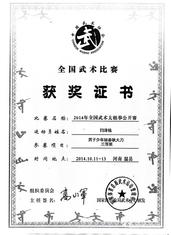 闫泽铭,男,1997年3月出生,现年18岁,温县番田镇东留石村人。自幼喜爱太极拳,师从太极拳名家,系统学习太极拳理论、五大流派套路及各类器械。由于勤学苦练,取得了优异成绩。2014年10 月,在全国武术太极拳公开赛中,获得男子少年组太极拳竞赛套路三等奖、春秋大刀三等奖,国家体育总局武术中心颁发了获奖证书。2015年6月,在河南省传统武术大赛中,获得男子传统长器械二等奖。2015 年8月,在河南省传统武术锦标赛中,荣获武式太极拳套路全省第三名,河南省武术运动管理中心、河南省武术协会颁发有获奖证书。 闫泽铭所获证书 |