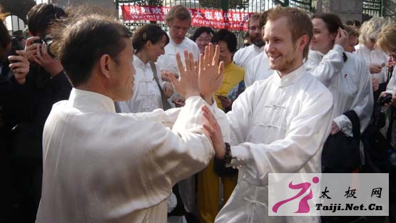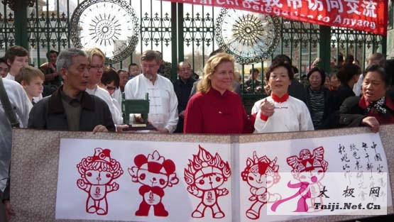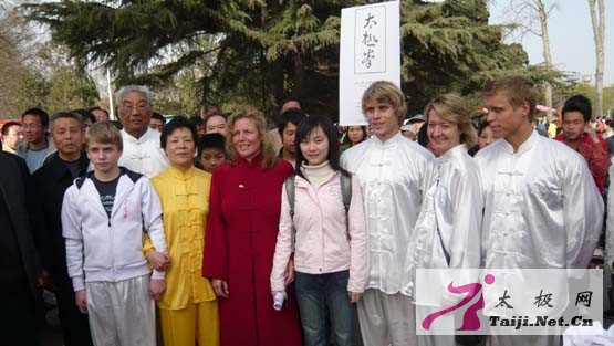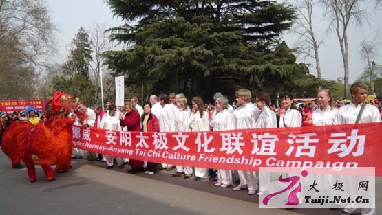 3月22日,应安阳市太极功夫表演团的邀请,挪威太极中心主任帕米拉•海蕾带领挪威太极拳交流访问团一行28人来安阳市进行友好交流访问。副市长王晓然在安阳宾馆会见了帕米拉•海蕾一行。 3月22日下午安阳市太极拳俱乐部在市人民公园举行了隆重的欢迎仪式,双方共同举办了“迎奥运 挪威•安阳太极文化联谊活动”。安阳市人民政府王建邦副秘书长致欢迎辞,原安阳市人大副主任杨学法、原安阳市政协副主席杨文周、安阳周易研究会长秦文学、安阳市殷都太极拳俱乐部理事长史晓明、安阳市太极功夫表演团团长陈汉菊等出席了联谊活动。 安阳市太极功夫表演团和挪威太极拳中心双方互赠礼品,安阳市太极拳俱乐部组织了大型的腰鼓、盘鼓和舞狮表演,几百名身着各色太极服的太极爱好者闪亮登场为挪威的朋友们表演了24式太极拳和太极功夫扇,安阳市太极功夫表演团为挪威的朋友们表演了他们创编的精编太极拳、太极剑,史晓明理事长和陈汉菊团长表演的太极推手和太极球赢得了阵阵喝彩,挪威太极中心主任帕米拉•海蕾女士带领他的弟子们为安阳的太极拳朋友们表演了传统杨式太极拳。随后双方进行了友好交流--帕米拉•海蕾高兴地说,安阳是周易的发源地,是太极拳文化的发祥地,这里的太极拳活动是我们感到非常的震撼,她表示,将组织更多的挪威太极拳爱好者来这里学习交流。