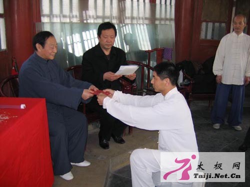 弟子阎安递拜师帖 陈永福老师系陈氏第二十世、陈氏太极拳第十二代传人、西安武术协会委员、西安市萃华武馆馆长。2006年被中国武术协会评定为中国传统武术陈氏太极拳小架代表人物之一,并被邀请拍摄了全国武术收藏教学系列片。陈永福老师弟子遍及海内外,众多弟子在各级武术大赛中夺金摘银,并在全国各地开设多家武术分馆。 阳春三月,春光明媚,鲜花盛开,陈永福老师又收新徙阎安和赵志忠。3月9日上午,收徒仪式在西安萃华武馆内举行,众多武术同仁和弟子见证了这一时刻。仪式由武馆秘书长职宝贵先生主持,过程按照传统武术拜师仪式进行,由烧香拜祖开始,弟子递帖、递茶、磕头,师父签字回帖并赠宝剑一把。最后陈永福老师给弟子训话时强调:为继承和弘扬太极文化要勤学苦练,细心揣摩,一滴汗水一层功夫。