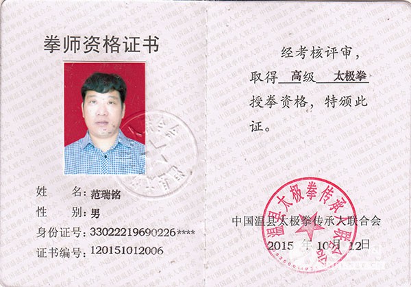 范瑞铭,善贤堂创始人,中国武术协会会员,中国武术六段,太极拳高级教练,浙江省传统武术功功勋级教练,陈式太极十二代传人,范瑞铭获得国际太极拳高级教练资格证,浙江大学班长会执行主席,宁波武协散打分会名誉主席,香港国际武术比赛名誉主席,自幼随父练习查拳,擒拿,中国式摔跤,武汉体院运动系武术专业毕业,89年开始跟随陈式太极十一代传人陈正雷大师练习陈式太极拳,器械,推手,后拜师入门,多次在国内,国际武术比赛中获得金牌,在香港国际武术比赛中被授于全球发展武术贡献奖,并一直出任香港国际武术比赛,舟山国际武术比赛名誉主席及仲裁委员,现在浙江宁波瑞铭太极养生堂及浙江大学班长会传授陈式太极拳! |