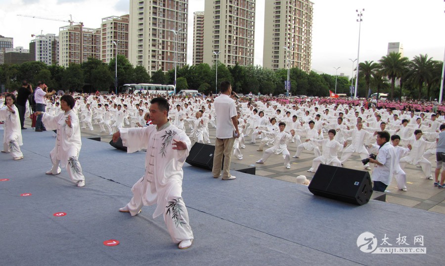(熊子兴(前)在首届温州市太极文化节千人太极拳表演中领拳)