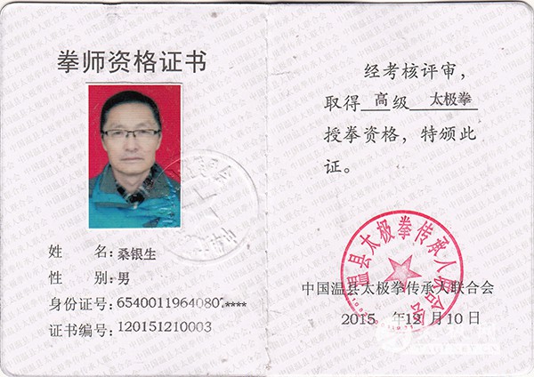 本人桑银生,1964年8月出生于新疆奎屯市,中共党员,大专学历。本人从小酷爱武术,2008年跟随新疆奎屯市杨式太极拳协会副会长,中国河南焦作陈照奎拳术研究会新疆分会副会长陈式太极拳第十二代正宗传人慕福才师傅学习杨氏太极拳,传统陈氏太极拳老架一,二路,新架一,二路太极剑,推手,擒拿及各种竞赛套路,并拜师。现已是陈式太极拳第十三代正宗传承人,并取得高级太极拳拳师证,国家武术二级裁判证。 |