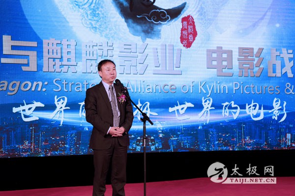 麒麟影业总裁庞洪在新闻发布会上致辞
