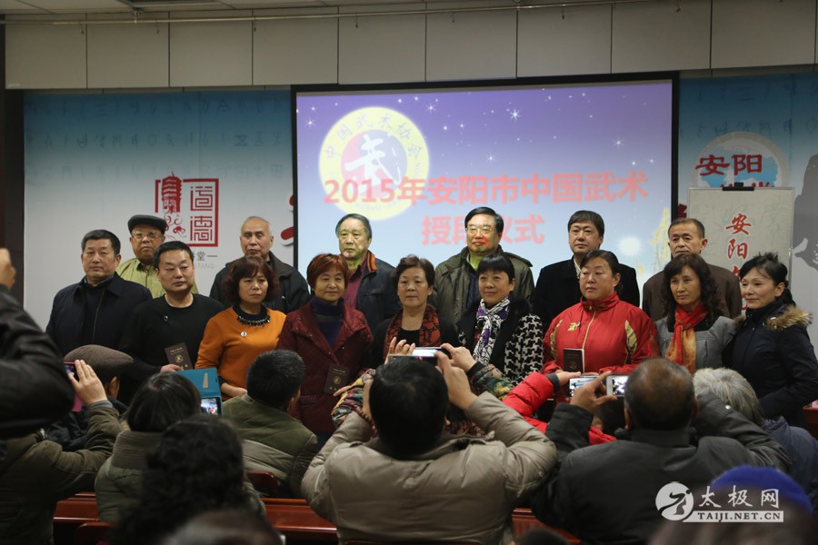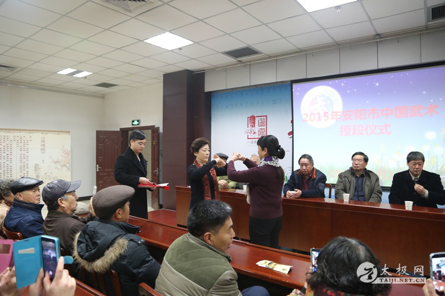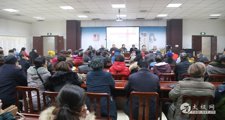 12月24日,2015年安阳市太极拳文化发展论坛在市图书馆博物馆多功能厅举行。市周易研究会会长秦文学、原市武术协会徐合林主席、安阳师院硕士生导师马爱民教授、中国武术七段市殷都太极拳俱乐部理事长史晓明、安阳市武术界专家代表刘耀荣、冯文军分别从不同角度阐述了太极拳与《周易》的关系,太极拳与身心健康,安阳市太极拳的营销策略以及我市太极拳发展现状、存在问题及对策。大家还围绕太极拳在全民健身中的地位和作用,如何提升太极拳在全民健身中的贡献率,太极拳活动如何更好的走进机关、厂矿、学校、社区和乡镇,如何用好中国武术段位制这个大平台把我市太极拳推向一个新的高潮等问题分别做了发言。 这次论坛由市委宣传部、市社科联和市文广新局主办,市图书馆、市殷都太极拳俱乐部承办。本次论坛由中国武术七段市殷都太极拳俱乐部主席陈汉菊主持。为了提高中国武术段位的社会影响力,营造出相应的社会氛围,形成社会共识,让拥有一定武术段位者得到社会的认可与尊崇,论坛会期间承办方为今年安阳市成功晋升中国武术四段和五段的8位同志举行了隆重的授段仪式,100多名太极拳爱好者参加了本次论坛,大家一致认为这次论坛举办的圆满成功,解决了很多大家平时在练拳过程中的疑惑,了解了很多太极拳方面的理论知识,很收启发和教育,授段仪式非常隆重庄严,这是一场实实在在的传播正能量的活动,大家很受鼓舞,市民纷纷表示,希望多举办这样的体育文化活动。