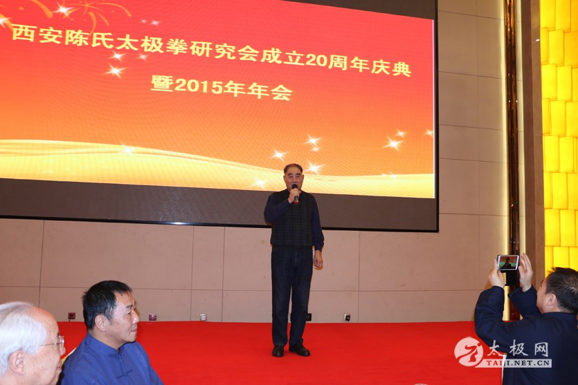 本网记者溯源西安市报道:2015年12月27日,西安市陈式太极拳研究会成立20周年庆祝大会在西安市广成大酒店隆重举行。出席大会的有陕西省武术管理中心党组书记 、武协副主席宋斌、西安市武协主席陈振虎、副主席方秀敏、秘书长范瑞明以及西安市陈式太极拳研究会各辅导站的代表、部分西安市的老拳师、原温县体育局局长原福全等,应邀参加了大会。500多人济济一堂,使庆祝大会在实朴中显得格外隆重。 大会始终,主席台的背景屏幕上,反复播放着介绍陈全忠大师及西安市陈式太极拳研究会太极拳活动的影像。除常规的议程外,陈全忠大师各地的弟子及研究会各辅导站的太极拳及相关表演,使庆祝大会充满着热情洋溢的气氛。