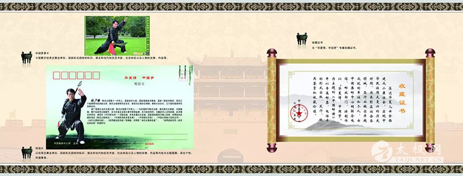 “华夏情,中国梦”纪念珍藏邮册由国家邮政、电信部门严格审批的盛世典藏纪念邮票精品,于2015年正式向全国发行。其以“和谐”标志印载的多种纪念邮票、明信片、电话卡,公开地向世界推出了太极名家谢广田(辽宁省朝阳市武协副主席)个人的拳、剑,春秋大刀等武术图案。 在纪念珍藏册中,发行部门撰文称:“邮票素有‘国家名片’之称。以‘华夏情·中国梦’为主题的中国邮册,是中国集邮中心网与国家邮政、电信等部门深度合作,为当代知名艺术家及社会知名公众人物精心设计和发行的纪念珍藏邮册。” 谢广田,陈式太极第十一代传人,国家武术七段,国家高级武术教练、国家一级武术裁判,现任辽宁省朝阳市武协副主席、陈氏太极拳研究会会长、陈家沟太极协会理事、朝阳分会会长,辽宁省形意拳研究会副会长。 谢广田师从当代太极大师、陈式太极第十代传人——冯志强修习陈式太极,擅长陈式太极拳、太极器械,精于实战性太极推手,多次在省及全国大赛中获得金牌。在习武的同时,注重武术心法和武德、武术理论的研究,曾担任《中华养生剑》 一书副总编,井有多篇论文在省、国家级权威性刊物上发表。其事迹先后被收录至《陈式太极拳志》 、《中国民间武术家名典》 、《中国世纪专家》 、《中国太极拳大百科全书》 、《当代太极拳名家》 、《世界著名武术家》等典籍,并荣获“当代太极拳名家”、“世界武林百杰• 武术名派名家”荣誉称号。 |