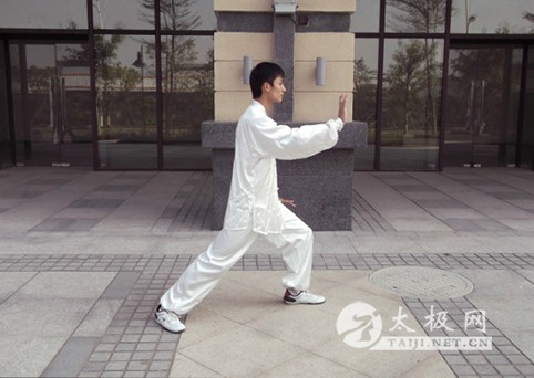 太极拳步法,可初分为定步和活步两大类。定步自起势双横步始,至搅雀尾式而为其大成;还有踢脚、蹬脚的独步等。活步则有前进步、后退步、横步、变步等等。 搂膝拗步式为前进步之代表,倒撵猴则是后退步之经典。定步的搅雀尾、单鞭两式后,有提手上势、白鹤晾翅 之变步,即紧接楼膝拗步左右式,是全套太极拳前进步之起始,也是所有活步的基础,是拳、掌、臂、身、腰各势、各劲的根基,极其重要。其根在足,此之谓也 搂膝拗步拳式的重点与难点,不在掌与臂,而在腰与步。 搅雀尾式为因定步所限,腰的旋转角度,只能少于180度。搂膝拗步式则有所不同;此式以腰部为轴的身躯旋转角度,可以达到360度。如初学者练习有困难,亦应不少于300度。 初练搂膝拗步,双臂可以完全放松,自然下垂,不作动作,专注于练习活步的步法。因为最难练、最难掌握并应用者,活步步法也。 白鹤晾翅式后,右足为实步,左足为虚步,此时以腰为轴,上身缓慢而均匀向右转动,开始下沉,腰部的旋转,向下、向右旋转,浑似螺旋钻地,全身得其沉劲。口吐气,可有微声以助其沉劲,是由阳变阴、由升而降之始。腰部和身躯转换动作以及转换处,都要柔润而圆转,有一个极小的圆弧形运动,作为动作变换之联结。面部随身躯之转动,逐渐转向正对后方,此时身躯已转到无可再转,即以腰为轴,改为向左旋转,同时仍继续缓慢下沉,由右转螺旋转变为左转螺旋,转变处仍为弧线动作。当身躯带动头部转向右前方或前方略偏右时,左腿借腰部左旋之内劲,向前方甩出,大腿动作带动膝盖、再带动小腿与左足,以拖步或滑步方式,迈向前方。腰部继续左旋,右膝不宜故意回缩或下压,应双膝略开,或顺其自然。待左足已经粘住地面时,上身继续以腰为轴,向左旋转,全身下沉,以其沉劲,求得其反弹劲,如大弹簧一压下,再一反弹,身躯重心即开始上升,身、腰、胯,都同时由后向前方移动,得两足双沉的“无极势”,左臂自然下垂于两腿之间,尚未搂膝,右掌运动为上凸弧形,此时大抵靠近右耳边,亦未向前推出。此“无极势”只有瞬间,左膝即开始弯曲,右膝任其自然,不可有意下压,或两膝略向外分开,左掌以圆弧形动作开始搂膝,右肩带动右臂再带动右掌,以上凸弧形动作,向前向下推出,推至右臂几乎伸直时,左小腿宜与地面相垂直,右腿则近于完全伸直,成弓箭步。此时,右臂应处于自然充分伸展的位置,左掌已完成楼膝动作,下沉于左膝的左侧,完成本式的第一个动作——左搂膝拗步。 左搂膝拗步之后,有一个手挥琵琶的动作;在左右搂膝拗步之前、之后,各有一式手挥琵琶。此式应练得十分潇洒、随意,以腰转动轴心,带动右腿前移半步,再虚领顶劲,将身躯重心下沉,松脊骨、松中胯,丹田与会阴穴,向左前足方向,极缓慢地向上、向前移动,蓄其左转之螺旋劲。因双足距离甚近,右足已移前半步,身躯重心极易越过左足掌粘地处,故丹田,会阴的弧形运动曲线的直线距离短,曲线距离长,身躯转动尽可能达到360度,其转速,比楼膝拗步式之身躯转速要快,起伏幅度亦较大,此要点宜予注意。 手挥琵琶的双手全走弧形,但须完美地体现“挥”这个字。身躯以腰为轴转动360度,极柔、极匀地带动双肩、双臂挥动,两掌感觉,几近于虚空无物,功夫深了,两掌有在水中轻轻划动的感觉。此时腰部须继续向左旋转,动作不停,右足向前半步,仍为虚步;腰转到面部向后无可再转时,才向右旋转,右足成实步后,再接第二个左搂膝拗步。 |