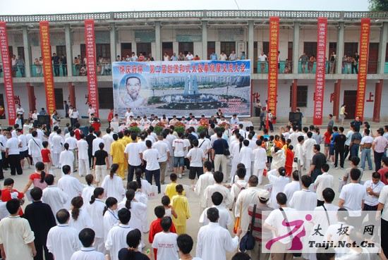 2008年7月11日上午,第二届赵堡和式太极拳观摩交流大会开幕式在赵堡和式太极拳的发源地温县赵堡镇举行。 恰值盛暑,烈日当空,骄阳似火,来自全国各地的和式太极拳协会组织以及当地村民汇集在了赵堡村委大院,这让本来还不算小的村委大院一时间摩肩接踵、人声鼎沸。在村委会大楼正中悬挂着一副巨大的大会背景图案上的和兆元正安静地注视着眼前这热闹非凡一切。和式太极拳传承近二百年,而全国性的和式太极拳观摩交流活动还是第一次在他的家乡——赵堡镇举行。 简短的入场仪式之后,全国各地协会组织在会场中央列出了整齐的方队,每列队伍之前的牌子标明了他们来自何方。几十列队伍,几十面牌子也可以表明发展相对滞后于陈、杨、武、吴、孙五大流派的和式太极拳现在已经花开遍地、风行天下了。队伍当中,我们能看到花甲老人、稚嫩顽童,当然还有英姿飒爽的巾帼英雄。骄阳之下,他们虽然挥汗如雨,但一个个看起来依然是热情不减、意气风发。在他们的眼神里,我好像隐约觉察到太极拳给他们带来的应该不仅仅是身康体健。 九点整,县市领导、和式太极拳当代主要传承人和有禄、和定乾以及各地和式太极拳的代表在主席台依次就坐。来自全国各地的和式太极拳爱好者共50个代表队参加了开幕式,焦作市宣传部长秦海彬、焦作市太极拳研究会会长、原市政协主席赵功佩、副会长穆玉华、焦作市体育局局长刘新顺、温县县委书记董安民、县委副书记、县长魏曰高、政协主席周青水、县委办公室主任秦迎军、县体育局局长宋明军等领导出席了开幕式,开幕式由温县人民政府副县长孙菊梅主持。县委副书记、县长魏曰高,焦作市体育局党组书记、局长刘新顺,清宫酒业有限公司总经理王集体等分别致词。魏曰高代表县委、县政府对第二届赵堡和式太极拳观摩交流大会开幕表示祝贺。之后,裁判员代表和参赛选手代表分别上台发言宣誓。 几声礼炮声响后,会场上空瞬间被漫天飞舞的彩条所笼罩,精彩的开幕式节目表演开始了。 最先登场的是温县形真武校的舞狮队,大小三四只狮子在节奏清晰的锣鼓声中翻腾跳跃着入场了。只见这几只狮子在场地中央随着舞狮少年的引导,或是摇头摆尾、或是翻滚欢腾,又或是相叠立起,场面煞是热闹,而周围的观众也不时报以热烈掌声和叫好声。 随后入场的各地和式太极拳协会组织团体代表次序上场表演了传统和式太极拳套路以及让人眼花缭乱的各种器械表演。在整个表演过程中,观众席的掌声始终都是此起彼伏,叫好声也是接二连三地不断传来。 最后压轴登场的名家表演,和有禄、和宝森、和定乾等刚一入场就引来了和式太极拳爱好者的掌声和欢呼声。在他们的表演过程当中,很多太极拳爱好者和各方媒体都手拿dv、相机捕捉着自己需要的画面。 在阵阵掌声、欢呼声中,四位和式太极拳代表人物结束他们的精彩表演,而此次赵堡和式太极拳观摩交流大会开幕式也圆满结束了。这时候,会场四周的太极拳爱好者纷纷涌入会场里与和有禄、和定乾等人合影签名留念。 根据大会安排,下午将在武术馆举行桩上徒搏项目的比赛。 今天,我很多次听到了“和协”一词,这是大家对和式太极拳协会简称。“和协”音同和谐,意虽不同,但太极拳隐含的理念与国家倡导和谐理念却是相同的。愿中华武林和谐,愿我们祖国和谐! [page]  [page]