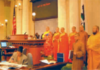 昨天,嵩山少林寺方丈释永信携28名僧众返郑,为期5天的美国加州“嵩山少林寺日”确立庆典活动就此落下大幕。 释永信方丈一行是3月19日应美国加州方面的邀请,前去参加“嵩山少林寺日”确立庆典活动的。每年3月21日为加州“嵩山少林寺日”,是被加州议会以立法的形式确立下来的,今年3月21日是加州的第一个“嵩山少林寺日”。 加州议会的文件称:“有着1500多年历史的少林武术文化正在向全世界传播。千百年来,少林武术的奥秘只是在少林寺内传授。今天,它可能是最具声望的中华武术,全世界人民都在研究和学习少林武术,加州也建立了很多学校和研究中心。加州文化是由多种民族文化混合而成的,而少林武术也是由少林僧人综合多种风格和技术而成的。”“今天,不同文化、不同种族、不同宗教信仰、不同经济和社会背景的人都在学习由少林寺开创发展的少林文化。现在,慓悍强劲、有益身心健康已成为少林武术的典型特征。鉴于此,加州议会确立每年3月21日为嵩山少林寺日,以用来提高少林寺在加州的声誉,把少林文化发扬光大。” 加州议会还拨出10万美元的专款,作为这次庆典的补助经费。 3月19日,中国驻旧金山总领事彭克玉、加州议会执行议长余胤良及夫人等到机场迎接释永信方丈一行。机场为他们专门开设了4个入境通道,一切行李免检直接被服务人员送到宾馆,5名联邦警察专门负责他们在机场的安全工作,离开机场后交由加州警察负责。余胤良夫人说:“你们享受的这种接待规格,就是国家元首来,也就如此了。”
