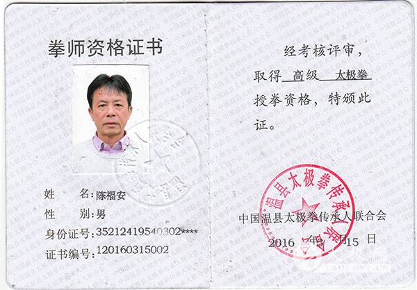 陈福安,生于1954年。1990年初随陈有芹老师学拳,再而到陈庆州大师家调整拳架。1992年跟随陈有华老师学习太极拳,剑。1998年在陈庆州大师家3个月,系统学习太极推手,二路炮锤。 1999年去新加坡工作至2008年,业余时间在新加坡兀兰,宏茂桥,马西岭民众联络所教拳,后又在新加坡国立大学,南洋理工教拳。 2011年被新加坡拳友邀请去教学调架3个月,另外在自己家乡也带出十几个弟子。 |