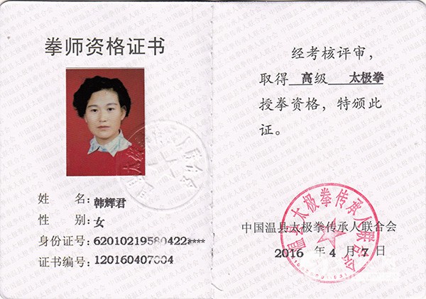 韩辉君,女,生于1958年4月。 自2000年开始习练国家统编套路以及器械等,2004年学习导引养生功十二法,养生太极掌。2007年开始通过视频光碟习练陈式太极拳三十六式,五十六式太极拳。 2013年开始跟随陈氏第十二代传人刘建华老师系统学习陈式太极拳,剑,刀。在2015年参加焦作国际太极拳大赛中,取得陈氏太极拳,剑奖项金牌。 |