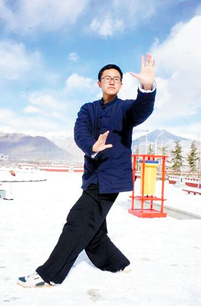 3月,天地俱生,万物始荣。拉萨宗角禄康公园里,晨练的人逐渐多了起来。杏花旁,柳芽下,人们散步、跳舞、打太极拳。一个两面临水的小广场上,有群人正随着舒缓的音乐,迈步如猫行,双臂随身划着圆弧。那气定神闲的样子,引起不少路人驻足。这群太极拳爱好者由藏、回、汉三个民族组成,有公务员、军人、市民、商人等等,仿佛一个其乐融融的大家庭。冬去春来,风雨无阻,他们已在此坚持锻炼长达三、四年时间。而向他们传授这种有益身心的传统文化瑰宝的人,却是一位戴着黑框眼镜,身材高挑,文质彬彬的小伙子。在拉萨,凡是练习太极拳的人都知道他名叫杨大卫。