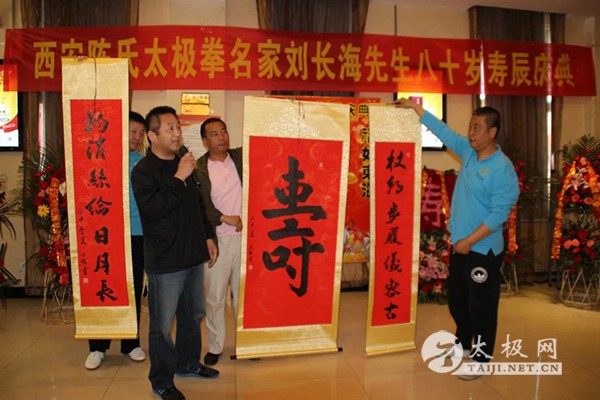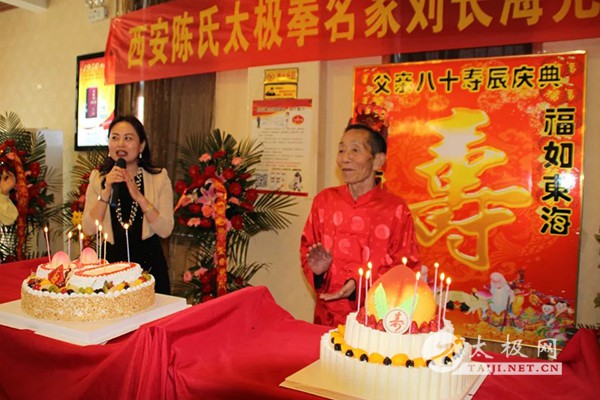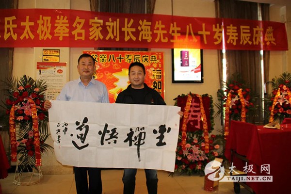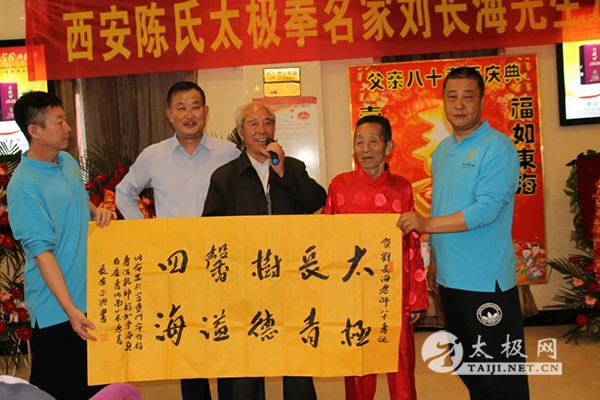 2016年 5月15日,在西安的大明宫唐御苑酒店,举行太极拳名家,刘长海先生的八十大寿。 刘长海先生,艺名陈德常。生于1937年4月12日。祖籍河南鲁山,现定居陕西西安。与1964年,开始习练陈氏太极拳。后师从陈氏太极拳四大金刚之一,国际太极拳大师----陈正雷老师,习练陈氏太极拳一路和二路。 习拳五十年来,恪守陈门武德规要,胸怀宽广无私,谨遵教,苦练功,钻研拳术之精妙,熟识陈氏太极推手和陈门兵器。深得老师喜爱,在1996年,被陈正雷大师正式收为入门弟子,2011年,晋升为入室弟子。 刘老先生现在以桃李满天下,门下得意弟子众多。 2008年,由先生发起组建,得到陈正雷大师的大力支持和同意,创建了《西安陈正雷太极拳研习会》,使陈正雷拳架在西安发扬光大 ,先生功不可没,培养了一大批优秀学生 。刘长海老师一生学习太极拳,传承太极拳,是我辈武术人学习的榜样。 我能认识刘长海老师,是老师门下一个优秀的学生兴隆,他告知我,他的老师要过八十大寿了,请我务必参加,来过后,熟知刘老师一生为传承太极,无私奉献的精神,深深的感染了我。 今天到会为刘老师祝寿的还有, 我的恩师,李树发先生, 太极拳名家 :王胜利老师 西安市武协副主席 :方秀敏 先生 西安市武协副主席:刘永强先生 西安陈子明太极拳研究会秘书长:张继伟先生 秦腔名家宋尚华先生之女:宋春莉女士 还有很多的太极拳名家及刘老师的同门师兄弟都来到了宴会现场,为刘老师祝寿。 宴会开始后,大家齐唱生日歌,家人并准备了两个大蛋糕,刘老师许愿后,满脸洋溢着喜悦的心情,和家人一起吹灭了生日蜡烛。 宴会中 ,很多的祝贺单位,为刘老师的八十大寿带来了书法作品,著名书法家张正兴先生,专门以刘老师的名字,书写了一幅书法作品,很是精妙。 刘老师的弟子们,也做了太极拳表演,以答谢老师传拳之恩。秦腔名门之后宋春莉女士,也现场清唱了两段秦腔,为老师祝寿。 整个祝寿宴会,在一片祥和的气氛中进行。。。。。。 但在会后,我想了很多,刘老师一生传拳,为弘扬太极,做出了巨大贡献,绝对是我们这些武术人学习的楷模。一个老人,五十年学拳传拳,清雅生活,淡泊人生的精神状态,不就是我们现在这一代武术人所追求的吗?我此刻心里油然的升起对刘老师的敬佩之情。 刘长海老师和来参加祝寿的来宾合影。 刘长海老师和来参加祝寿的嘉宾合影 刘老师和他的家人合影 刘长海老师和他的弟子们合影 西安武协副主席-----刘永强先生致辞 著名书法家张正兴,为刘长海老师赠送书法作品 刘长海老师的弟子兴隆,为刘老师祝寿送的书法作品。 刘长海老师八十大寿的寿桃。 各界人士,为刘老师祝寿。 书法家张正兴,给兴隆先生送的书法作品。 本文撰稿人,张勇刚和刘老师合影。 |