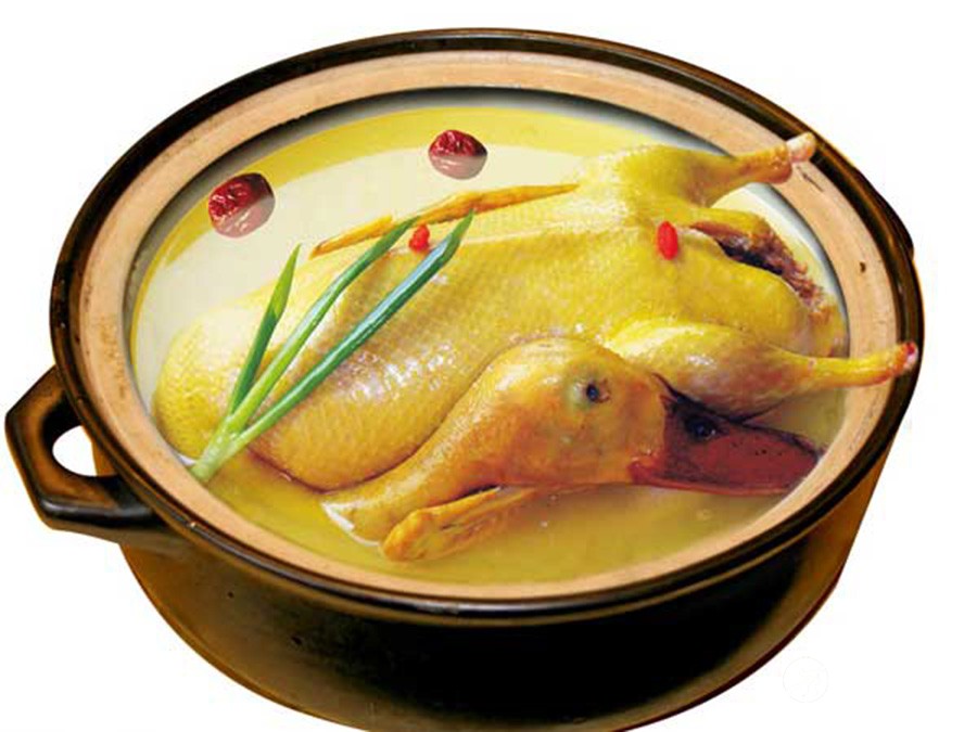 夏季 鸭肉营养丰富,每100克含蛋白质16.5克,脂肪7.5克,还含有碳水化合物、各种维生素及钙、磷、铁等多种营养素。 《日用本草》载,鸭能“滋五脏之阴,清虚劳之热,补气行水,养胃生津,止嗽息惊”。《别录》说鸭可“补虚除热,和脏腑、利水道”。可见,夏季食鸭,既能补充过度消耗的营养,又可祛除暑热给人体带来的不良影响。 鸭属水禽,性寒凉。以中医“热者寒之”的治疗原则,鸭肉特别适合于体内有热、上火的人食用。低热、虚弱、食少、大便干燥和水肿者食鸭肉较为有益,而这类病患者多见于炎热的夏季。 |