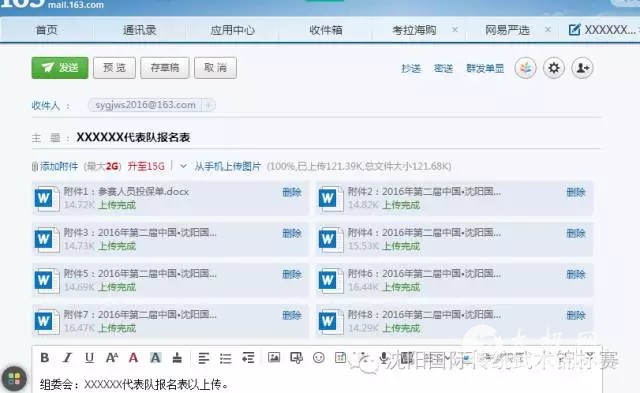 十、其它 1、为感谢各参赛单位对比赛的支持,组委会决定于2016年8月5日17:30举行欢迎晚宴,请所有领队或教练员参加。地点:沈阳航空航天大学餐饮中心四楼宴会厅。 2、为使本次大赛真正达到“厚德博学、弘扬武术文化、团结共进”的目的,凡参赛的队伍,可以录制2-3分钟宣传本队的视频资料(DVD格式),比赛期间在体育馆内大屏幕上循环播出。请将视频于7月2日前传至:1821732254@qq.com,主题必须注明:“武术比赛+XXX队伍宣传片”,不按期或不按要求上交的队伍视为放弃。要求:视频可以有声音、字幕等,但是不能有招生相关信息。 3、为了丰富赛会文化内涵,显现辽宁文化底蕴,展示沈阳旅游资源,大赛组委会定于8月7日,中午12:00组织免费参观我国最大的古生物博物馆-辽宁古生物博物馆,需各代表队在报到时报名,集合地点:航天航空大学体育馆门前集合统一发车,14:00返回赛会。 4、未尽事宜,另行通知。 5、解释权归大会组委会。