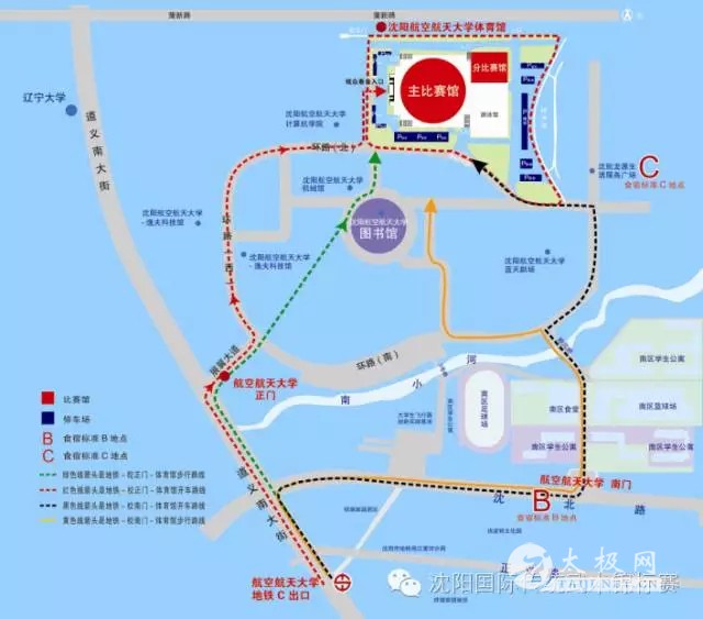 2、同时提交电子版报名表、电子版报项表、电子版保险单,以粘贴附件的方式上传到大赛组委会公共邮箱:sygjws2016@163.com(需在主题处注明XXX代表队报名表)。 比赛竞赛规程及报名相关表格可登陆www.tieyunwushu.com下载或者请教练员或领队加入QQ群334069679(名称:沈阳国际武术锦标赛,群文件里有比赛竞赛规程和报名相关表格,可以下载,入群后请把群昵称改为:省地市+队伍名+姓名)。请关注官方微信平台:“sygjws”,名称:沈阳国际传统武术锦标赛 。也可以加微信号13889309888(已经建立微信群)。 3、报名后不得更改项目,会务组将于7月17日,在大赛组委会官方微信公众平台、微信群、QQ群里,发布比赛日程表及项目分组情况表,请各参赛队核对,并于7月20日前上报纠错;如赛前更改项目,每项需交纳100元。 4、裁判员自带规则、自备深色裤子黑皮鞋,2016年8月5日下午13:00前到沈阳航空航天大学体育馆比赛场地报到。 5、①各参赛队于2016年8月5日下午13:00-15:30,派1名领队或教练员(持身份证)报到,领取秩序册、证件及纪念品等; ②参加“国际传统武术高峰论坛”的人员,请于2016年8月5日下午13:00前报到; ③组委会、教练员裁判员联席会定于2016年8月5日16:00举行。 ①②③地点:沈阳航空航天大学图书馆二楼,多功能报告厅。 【注】地铁2号线‘航空航天大学站’,C出口出站北行。