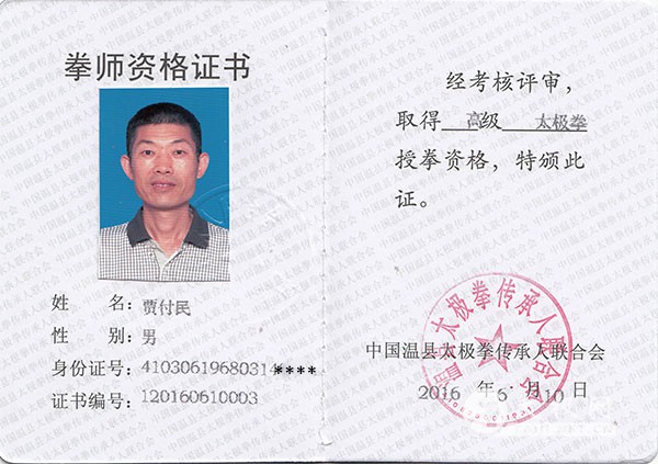陈式太极拳传承人贾付民获得太极拳高级拳师证书