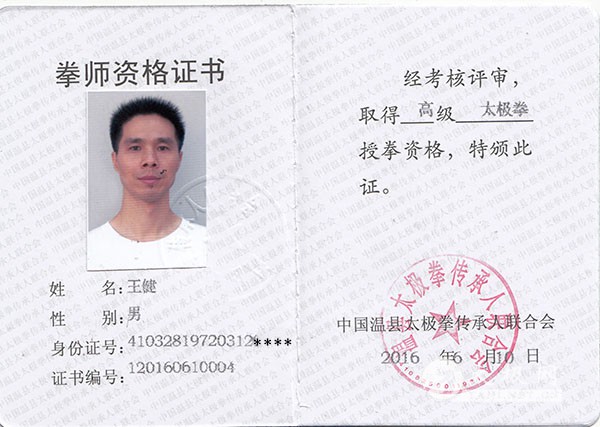 王健,男,汉族,大专学历,1972年3月出生,河南省三门峡市,现在洛阳石化总厂任职。陈氏太极拳第二十一世、十三代传人。2011年5月师承陈氏太极拳第二十世、十二代传人程元富习练陈氏太极拳、械。 在习练太极拳、械过程中,刻苦习练,谦虚上进,为人忠厚,尊敬师友,时刻树立“四心”(决心、信心、耐心、恒心),以弘扬太极文化,承传传统太极风格,以传播传统太极文化为己任,受到了人们的好评。 2015年8月20参加日第八届中国焦作国际太极拳交流大赛在男子D组陈氏太极剑及陈氏综合太极拳个人比赛项目中荣获二、三等奖。自2014年至今在洛阳市河阳太极养生馆独立完成太极拳教学任务。 |