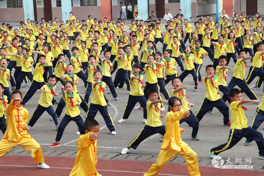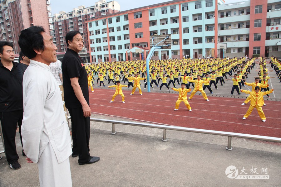 | 伴着朗朗的读书声,四年级的学生们穿着整齐划一的服装,在操场上有板有眼地演练着陈氏太极拳。这是太极网记者在江西省宜黄县凤岗一小和水北学校看到的和谐景象。把传统国粹引进菁菁校园的,是来自太极拳发源地陈家沟天才太极院的王清富老师。王清富老师在一年前受到宜黄县教育局长罗时强的邀请,来到这里,传授同学们正宗太极拳。 (左一王清富陪同朱天才大师观看学生们演练太极拳) 凤岗一小的李校长在接受记者采访时说道:“太极进校园实际上全国都在做一个六进的工作,并且一直以来我本人就非常热爱太极拳。太极拳应该说是我们中国的传统文化,也是世界非物质文化遗产。对中国传统文化我们学校向来重视,不光说太极拳,在其他方面也进行了许多探索。在教学方面,中国传统文化不外乎,是《弟子规》、《三字经》国学这些,我想来想去除了这些之外,太极拳运动是一个非常好的切入点。我们学校经过大半年的筹划,由朱天才大师的弟子王清富老师到宜黄传授太极拳。首先我们在一个年级搞试点,就是四年级。我们这个年级有八百学生,老师和学生共同练,作为校长我也在练。后面通过我们学校还有教育局下发的文件,县委政府也参与了这个活动。我想,以后的六一、国庆,都可以把这种运动搬到舞台上来,让所有的小学生都知道练太极拳有好处,也是一种对传统文化的爱国主义的教育。我们全县也不光我们这个学校在做的,对面的三中、二中、实验小学、二小都在蓬勃的开展,教育局给我们下发的这个文件是让我们这些学校派去老师、太极拳爱好者专门去组织学习,经过几个月的这个培训,应该说是条件也相对成熟。” 当记者问到太极拳进入校园给师生们带来的益处时,李校长高兴地说:“初步理解看,第一个老师学太极拳,对身心健康方面,也是有益的。有些人性格比较暴躁的话,学习太极拳之后性格会变得柔和一点,取得平衡心情的作用。小学生学这个,还有教材,教材中还有传统道德规范教育,例如学武术一样要注意哪些方面, 哪些可以做,哪些不可以做,通过这些规范学生行为,练太极拳心神专一,对学习,对身心健康都是非常有好处的!” |