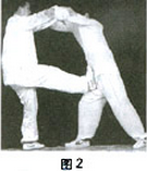 踢法各拳种都有之,太极拳要求上肢封闭住对方后,再用踢法,这样对方不易逃脱。同时,要求用力松紧辨证,巧使力点,要求速度迅猛,击后即收,上肢立即补救。踢时要把重心移稳,站立的腿要微屈弯,然后,根据技击目的不同,而采取相应踢法。 如“右分脚势”:接上势,左手上转划弧,右手下转划弧,两手胸前交叉。同时,脚侧上在右前方成盖步(这是提踩技击法),重心在右,双掌向上不高于眼,左右分开与肩平。重心再向左移,同时,右脚侧上踢,右手迎击脚面,高踢脚取对方上部,如踢击手腕、胸肋、脸部等。踢时脚尖领劲,也可以脚尖下勾用脚面发力;要以胯根为轴心,起脚猛击目标。底踢脚如“金刚捣碓”:接单鞭,右勾手变掌走下弧,向左转体前引,与左手配合变捋,重心移于右,再下划弧折叠,前移重心。左手划弧上,右手上托变掌,右膝上提(膝顶法),沉肩垂肘,松腰落胯,气沉丹田,劲贯膝盖;然后用小腿弹踢对方裆部或臁骨。要利用膝关节的轴心摆动,脚尖领劲,迅速踢击,踢后急收,落时变跺击。倒骑龙也有这种踢击法。 2、蹬击法(图2)