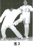 这也是武术常用技击法。太极拳蹬击,同样要求上肢封闭住对方后,发腿蹬击对方小腹部和裆部。蹬姿应脚尖朝上里勾,力从脚跟发出。 例如“抱头推山”:接小擒打势,两手左上右下,双顺交叉于胸前。同时,以左脚跟为轴转体180度,将左脚带回成前虚步,重心在左,双手下分于两膝外侧,双手再向上转立圆于两肩侧,身体微向左转,右腿膝盖领劲上提,脚尖上勾脚跟用力,向对方蹬出,落地可用踩跺。然后双手向右膝上平推,同时,重心移右。“白猿献果”也有这种蹬击法。 3、踹击法(图3)