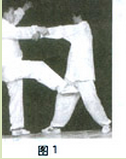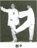 拳论“近便加膝”,指的是膝盖直接上顶击裆部、两肋或下颚,或用膝顶跪对方膝盖。用时先将重心移放到一腿上,要松腰胯,气沉丹田,目视对方的所受击部位,以膝盖领劲,屈膝上提猛击目标部位。 在“金刚捣碓”、“金鸡独立”、“白猿献果”、“抱头推山”、“前趟腿”等拳式中,都有用膝顶法。 如白猿献果:承接“指裆捶”,双拳顺缠,旋转向前侧上冲,不得高于眼。同时,以左脚跟为轴,身体左转90度,右腿膝盖领劲上提顶裆,脚尖上勾助力,成左独立步。 歌诀: 白猿献果乃比喻,两拳似桃难充饥。 献桃敬你没实意,上有双果下用膝。 虚实难断先封闭,直来横取莫迟疑。 9、膝克法(图9)