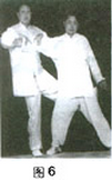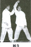 这是提膝用力向下踩击对方膝关节的技法,在“高探马”、“小擒打”、“捣岔”等式中都有这种技击法。踩击时目标要准,力度应猛。 “小擒打”:接掩手肱拳,右手上领劲并顺缠,左手用掌推击对方前胸。同时,提右膝,脚尖向外撇,踩对方的膝盖,成为右步盖步,重心移右,上左步踹击并管步。同时,左手顺缠走上弧,微向后捋,右手变掌逆缠,然后,左手变逆缠,右掌从右小臂下推出,重心移于左。 歌诀: 右拳解脱顺势穿,左掌肘下攻肋间。 右脚外撇踩膝盖,左顺右逆同划圆。 左腿跟上管套步,左右走弧折头弯。 拧腰转体一气成,上下相合克敌坚。 5、跺击法(图5)