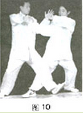 “足来提膝”指的是提膝护裆、护臁骨,或用横顶击对方弓腿与肋部。主要对付对方的撩阴腿、磕膝腿,势与势之间的连接转换常用横击膝克法。 例如“单鞭”:承接六封四闭势。左手转上弧右手转下弧成抱球动作,再左下右上成抱球动作。然后,右手五指撮拢成勾手,从左手上拉于右侧,同时,腰向左转,左手顺腰回到腹前。重心不变,欲左先右,左虚步提起,用膝盖护裆,成右独立步。然后用左脚跟向左蹬出,足尖里扣,重心在右。重心移向左腿,同时,右手上转向左掌心,向前变成单鞭,重心在左,两臂屈而不直,胸含腰塌,肘下沉,肘尖向下。 歌诀: 两手抱球转立圆,右先左后缠一圈。 双手绞缠划半圆,右勾伸出三节弯。 右脚扎根轮轴转,左膝里扣护裆臁。 伸出左脚横铲地,横移重心肘领先。 转腰左掌向上穿,逆缠划弧向左转。 腰胯还原三合劲,长蛇一字成单鞭。 虚领顶劲精神贯,内气沉丹充腰间。 10、撇击法(图10)