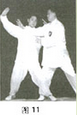 这是破坏对方重心或解脱对方管套的一种巧技法。它是以脚跟为轴心,脚尖微离地上翘,以身体旋转为动力,通过左右旋转发力。其作用:足破足、膝破膝、胯破胯,如果能与上肢配合好,击倒对方只在一瞬之间。因此,练拳要注意这一技法。撇击法表现拳势转换处,常被人们忽视,脚尖的上翘、里扣、外撇、下落尤为重要。它既有技击效能,又有转体稳定重心的功能,因此,练者要细心研之。 例如:太极拳起转金刚捣碓势,就要做到两个外撇动作。起势转捋、护中的动作,右脚尖微翘,随转体90度外撇,重心移至右腿,再移稳重心后,提左膝护裆,左腿脚跟铲地而出,并落地里扣管套,上肢折叠后,转为下捋前移重心时,左脚须外撇,再弓步上右脚踢击,落下跺击,完成金刚捣碓势。 “六封四闭”转换“单鞭”的承接动作。六封四闭右脚尖外撇走单鞭勾手形成后,重心在右,提左腿护裆里合,做到左肩与右胯相合。然后,左脚脚尖翘起,脚跟铲地,从侧旁徐徐蹬出;移重打左击肘时,切记右脚尖要里勾撇,这个动作既能破对方重心,又能躲避右膝被踩击的危险。 11、套管法(图11)