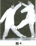 踹与蹬击法不同之处,蹬击脚尖朝上,踹击脚尖平侧;蹬击是取正面进攻,踹击是取对方侧面攻之。 如“左蹬根”:接左分脚,双掌变半握拳,合于腹前,用十字封闭。同时,以右脚跟为轴,转体180度,方向朝北,左脚落于右脚左侧,重心在右。然后,提膝领劲,高与胯平,含胸拔背,松腰落胯,气沉丹田,踹时脚尖里勾,脚跟用力,注视目标,迅速猛踹发劲。上肢两手向两侧冲击,要起到保持平衡、稳定重心、防护搬腿的作用。 歌诀: 双掌变拳合于腹,左转体松右负重,上下紧合气存丹,左足踹击拳外冲,发劲脚跟须领劲,右足踏实植地中,踹脚双手先封闭,踹击敌侧须猛攻。 4、踩击法(图4)