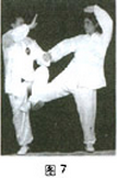 这是武术常用进攻技法,它威力之大,空间面积之广,上中下都能用扫,上取头部,中取腰,下扫对方站不牢。扫击法有正与反,单扫击、双扫击等几种。扫击时要把腿伸直,以胯为轴心,以躯干旋转为动力,把劲力送到接触点上。练时应注意腿的周围要贯内劲,扫时要与上肢配合,错对合力发劲。 例如“旋风脚势”:承接护心拳,双拳变掌向右前逆缠作引,重心不变,双手走下弧,捋于胸前交叉,右脚提回,在左脚前变盖步,脚跟着地交叉,手双逆缠下按。同时,重心向右移,以右脚跟为轴,左脚跟离地,重心向右移时转体90度。双手平开,大腿里摆扫击,手击脚里侧合劲。脚先旋转180度,再转体90度。 歌诀: 拧腰扣裆急转身,紧接里合旋风腿。 旋脚击到中心处,一脚随时要真魂。 7、提击法(图7)