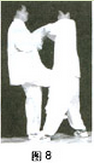 提击法是破坏重心的击法。用者先要稳定重心,上肢要用引法迫使对方重心变换,然后应急提脚勾对方脚跟,钩提时要根据脚尖方向提击,破坏对方重心而趁机击之。 例如“右分脚”:接上高探马势,左手上转划弧作引,右手下转划弧,于胸前交叉。同时,左脚膝盖领劲,用脚上钩提对方前弓腿,落在右腿外侧成盖步;双掌向上托,左右分与肩平,重心左移。同时,右脚侧上踢,右手迎击脚面。 要点:盖步寓上先下,加外劲,松胯塌腰,重心要稳,拍脚击点要准,不要弯腰。应注意胯根轴的旋转,头应顶劲虚领。 歌诀: 两手胸前划立圆,右下左上十字。 左脚勾提踩膝盖,双分缠绕求平衡。 重心踏稳踢右脚,右手下拍脚相迎。 浑身上下合住劲,踢脚击点要弄明。 8、膝顶法(图8)